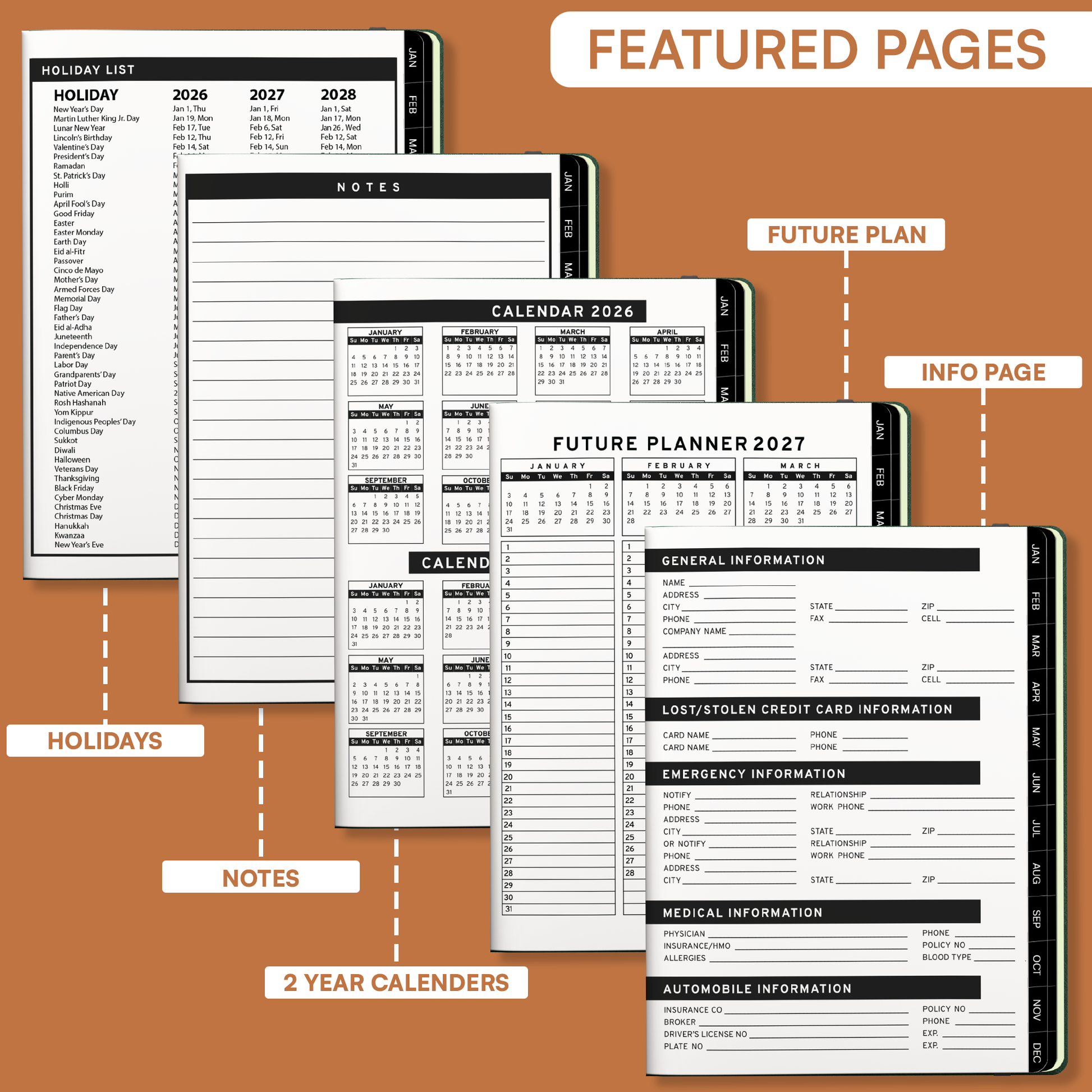 - Future Planning: Additional pages planner with hourly schedule, 3-year references for; holiday lists, calendars, birthdays/important dates, contacts, and notes.