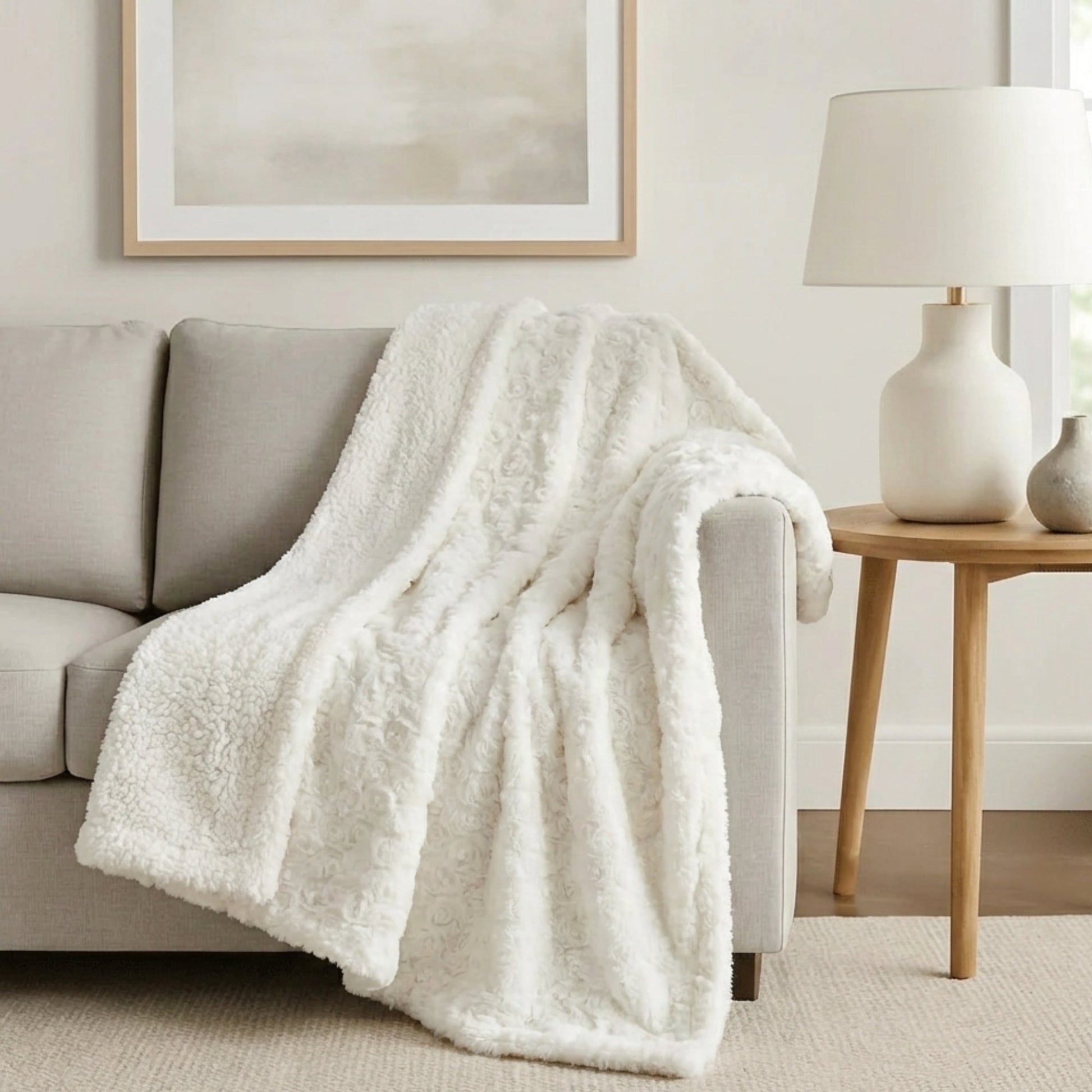Wrap yourself in the unparalleled softness of our Soft Luxury White Roses Sherpa Faux Fur Throw Blanket. Featuring a delicate white rose motif embossed into lush faux fur and a decadent sherpa fleece backing, this versatile throw delivers premium warmth and refined style wherever you use it.