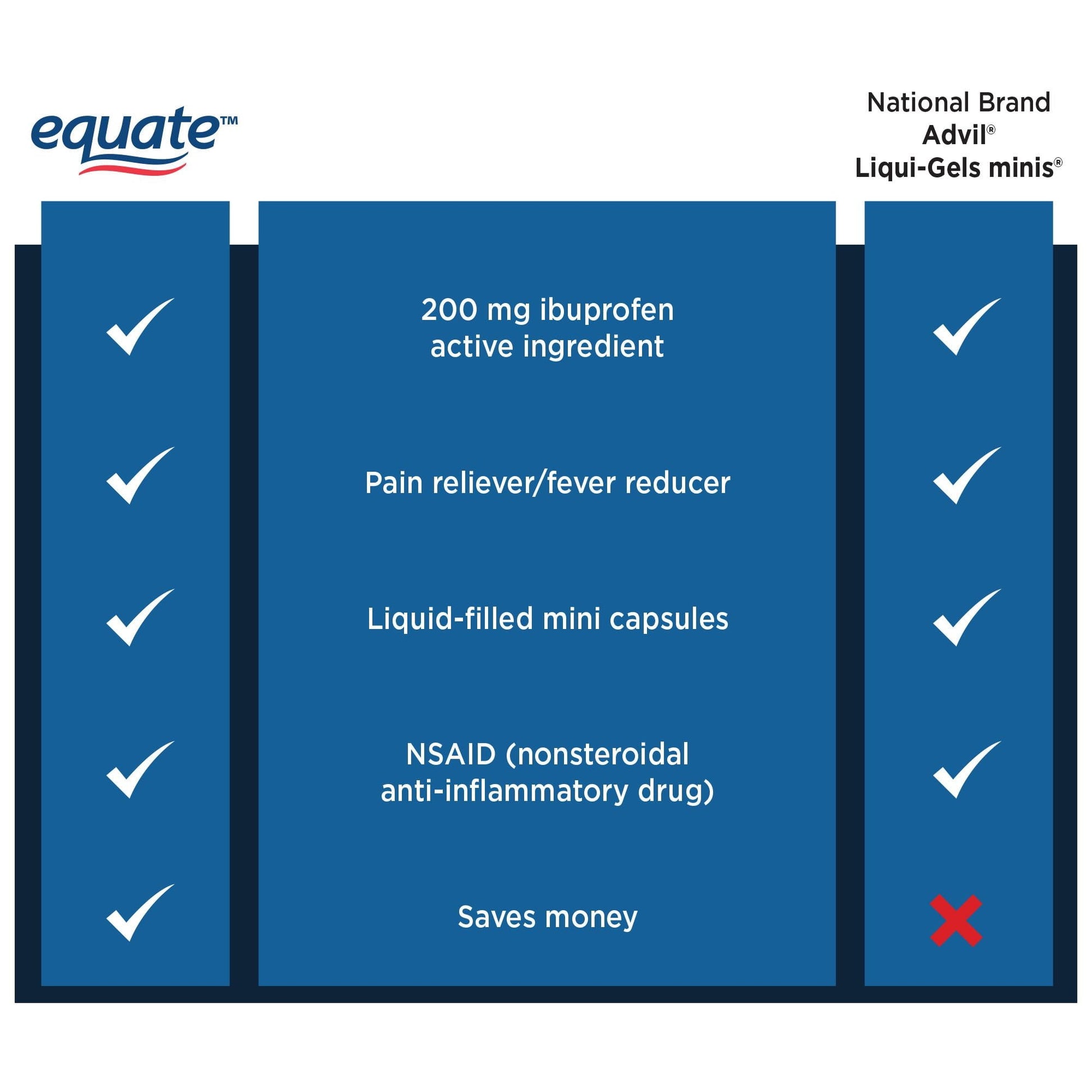 Get the pain relief you need from Equate Ibuprofen Mini Softgels. Take one tablet every four hours to six hours when you need relief from pain caused by minor pain of arthritis; headache; muscle pain; toothache; backache; and menstrual pain. You can take it when you are sick to bring down your fever and keep aches and pains away. This bottle contains 300 capsules at 200 milligrams of ibuprofen each. Keep it in your medicine cabinet; car; or your desk at work; so you can have it within reach whenever you need it. Pick up Equate Ibuprofen Mini Softgels today to get the relief you deserve.