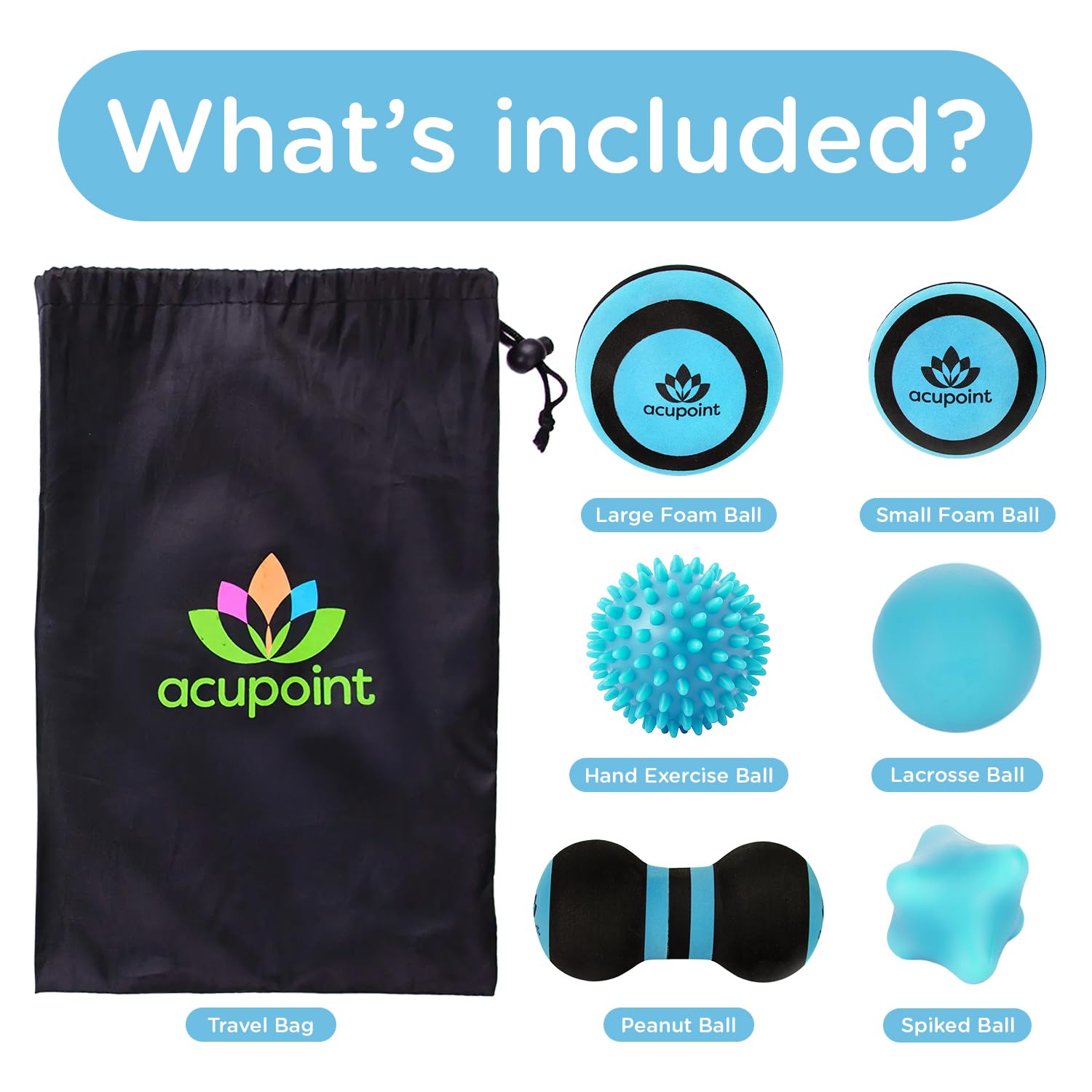 - COMPLETE MASSAGE BALL KIT: This set includes a trigger point peanut ball, a large foam ball, a spiked massage ball for feet, a lacrosse ball, a small foam ball, and a hand exercise ball. It comes with a convenient carry bag.