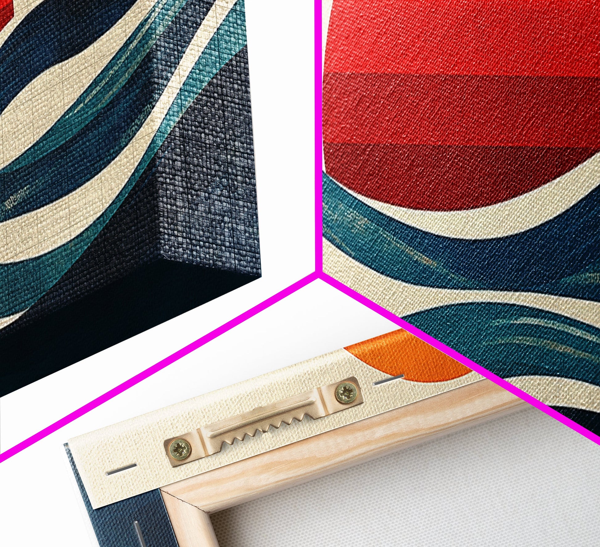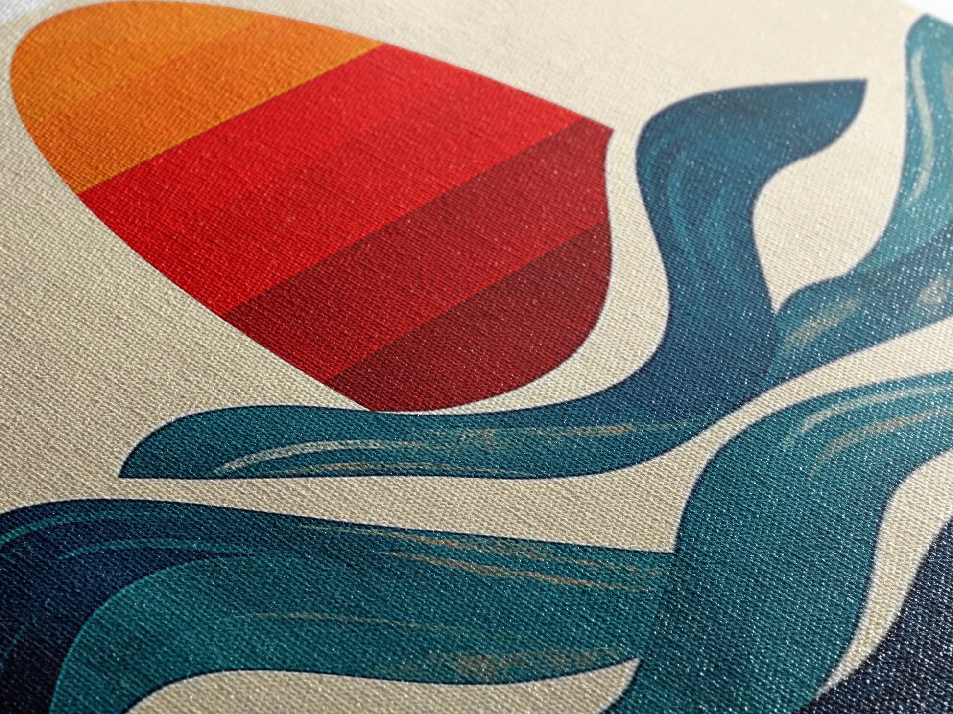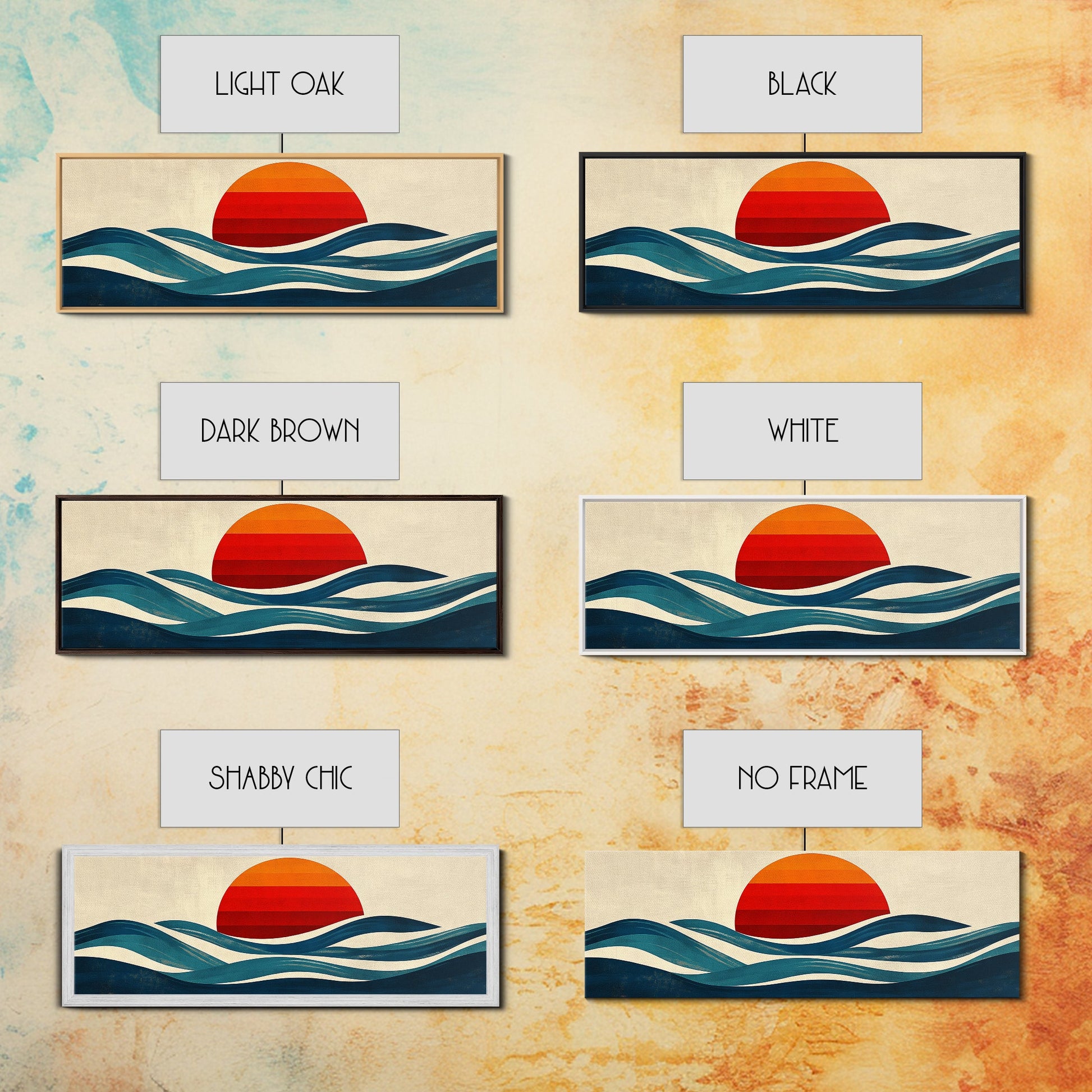 Retro Art Deco Sunset over The Ocean, Framed Canvas Print, Vector Image Style Artwork, Wood Frame, Boho / Eclectic Home Decor, Minimalist Decor