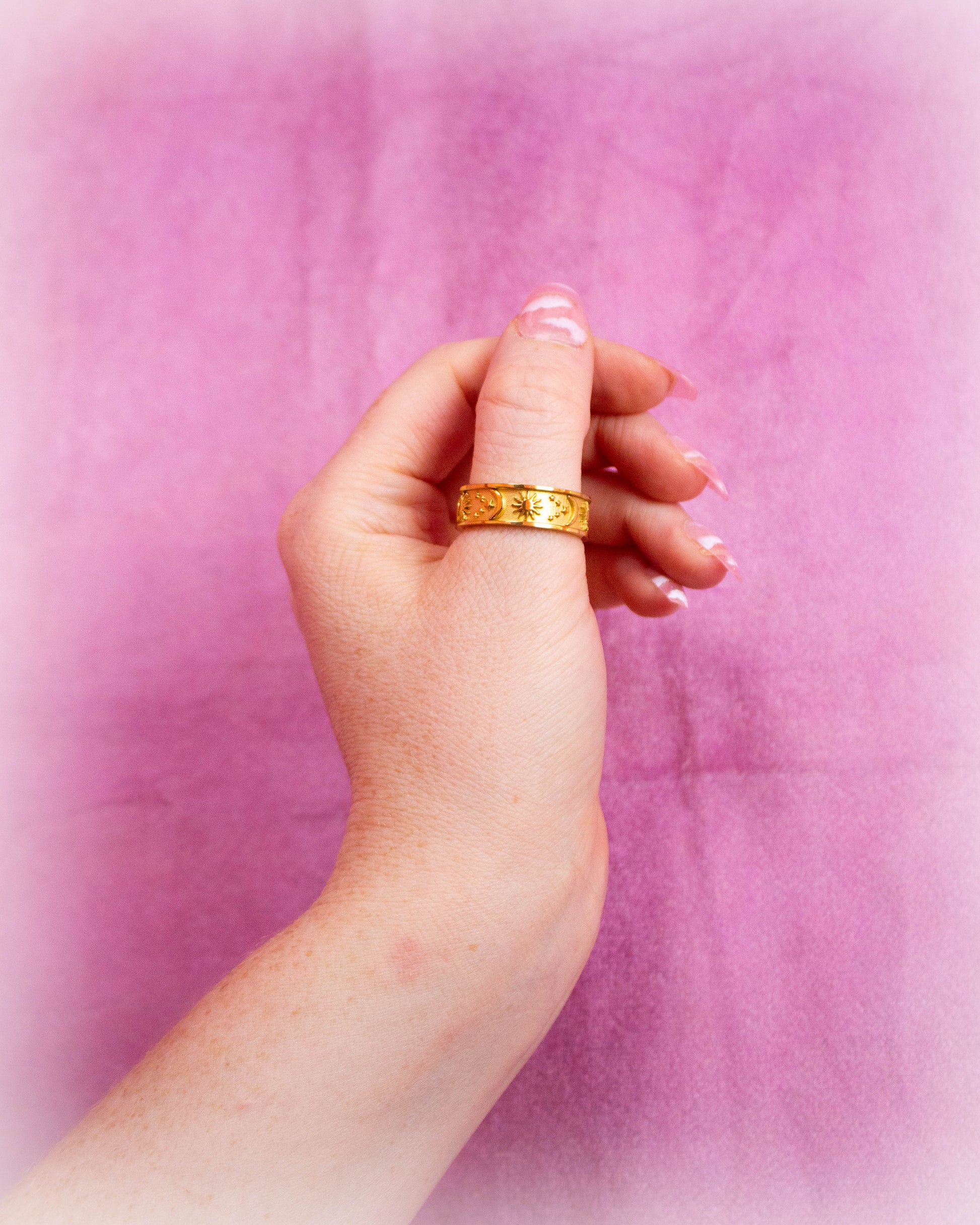 Crafted from durable titanium, this band features beautifully embossed sun, moon, and stars, symbolizing harmony and balance. Its lightweight yet sturdy design ensures comfortable all-day wear, making it a meaningful accessory that complements any style. Embrace celestial elegance with this timeless piece.